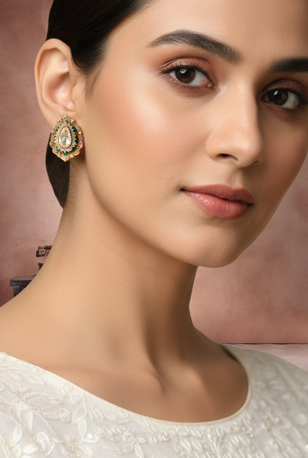 At the heart of these earrings lies a striking moissanite polki stone, surrounded by shimmering cubic zirconia, further encased in beautiful takkar stones.