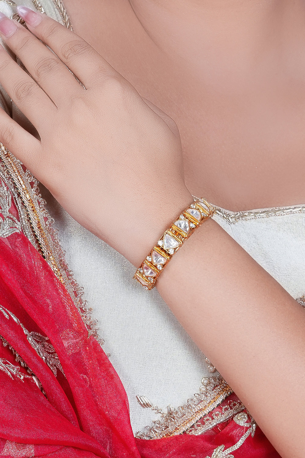 The Kamla Bracelet is an exquisite creation that celebrates the harmony of Geometry and Heritage. Adorned with a seamless row of triangular Moissanite Polki stones, each stone is meticulously set in a warm gold-toned bezel, framed by delicate Cubic Zerconia accents that enhance its brilliance. Its linear and symmetrical design reflects understated opulence, while the handcrafted artistry lends it a timeless, heirloom-like appeal. Designed for women who love modern minimalism with a touch of tradition, the Ritva Bracelet is perfect for both celebratory and formal occasions.