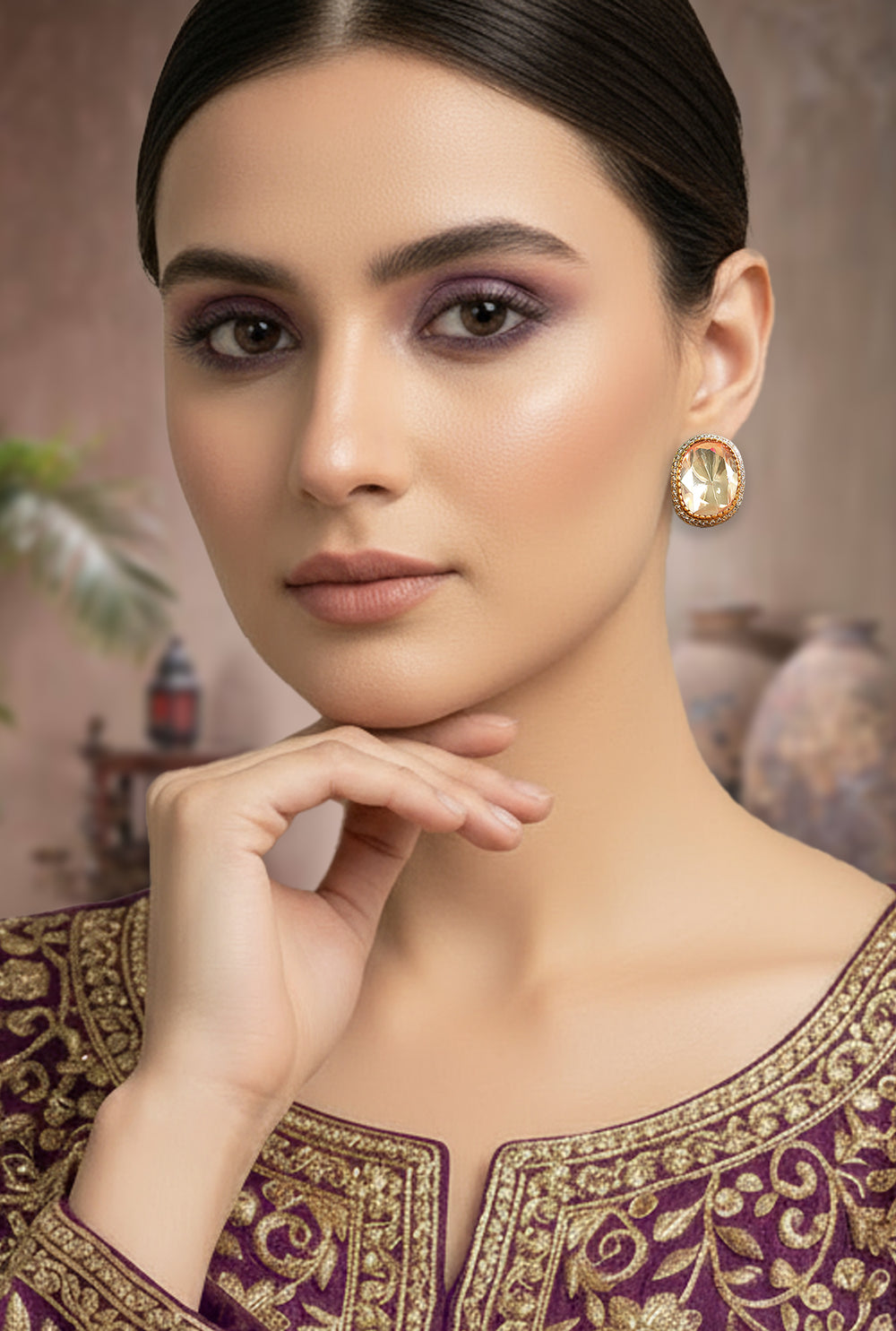 The Kanika Studs radiate effortless charm with their soft champagne shimmer and vintage appeal. At the center of each earring sits a finely faceted unshaped moissanite Polki, reflecting warmth and clarity in every angle. Framed in a gold-beaded inner rim and surrounded by a dainty halo of white zerconia stones.This beautifully faceted stone reflects light in soft sunlit tones, making it a versatile day-to-night piece.these studs are crafted to emulate the richness of old-world charm while keeping the silhouette clean and modern. The base metal features a polished antique gold finish, enhancing the luxe appearance without overwhelming the minimal elegance.