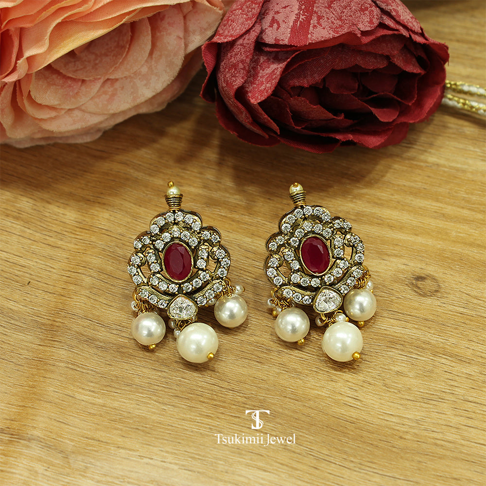 The Kanira Choker Set is a masterpiece of royal grandeur, blending Heritage Artistry with modern elegance. Featuring a striking central pendant, this set is adorned with a rich combination of Ruby hued Takkar stones ,White Polki stones, and glimmering Cubic Zircons. The necklace is crafted from multiple strands of fine ivory pearls interspersed with tiny red bead accents, creating a regal layered look. The Set, with its intricate floral-meets-geometric design, is enhanced by pearl danglers for a majestic finish. Matching earrings mirror the grandeur of the Set, completing this luxurious set.