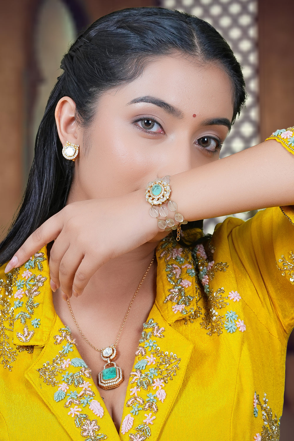 The Meghna Bracelet is a delicate fusion of nature’s serenity and timeless artistry. Featuring three rows of translucent, oval beads that mimic the calm clarity of water droplets, this bracelet is anchored by a stunning central floral motif. The centerpiece is adorned with a pastel-green Faceted Cabochon , encircled by shimmering cubic stones set in a gold-toned frame, radiating subtle elegance. Its lightweight, airy design is perfect for women who appreciate understated luxury with a natural, fresh vibe.