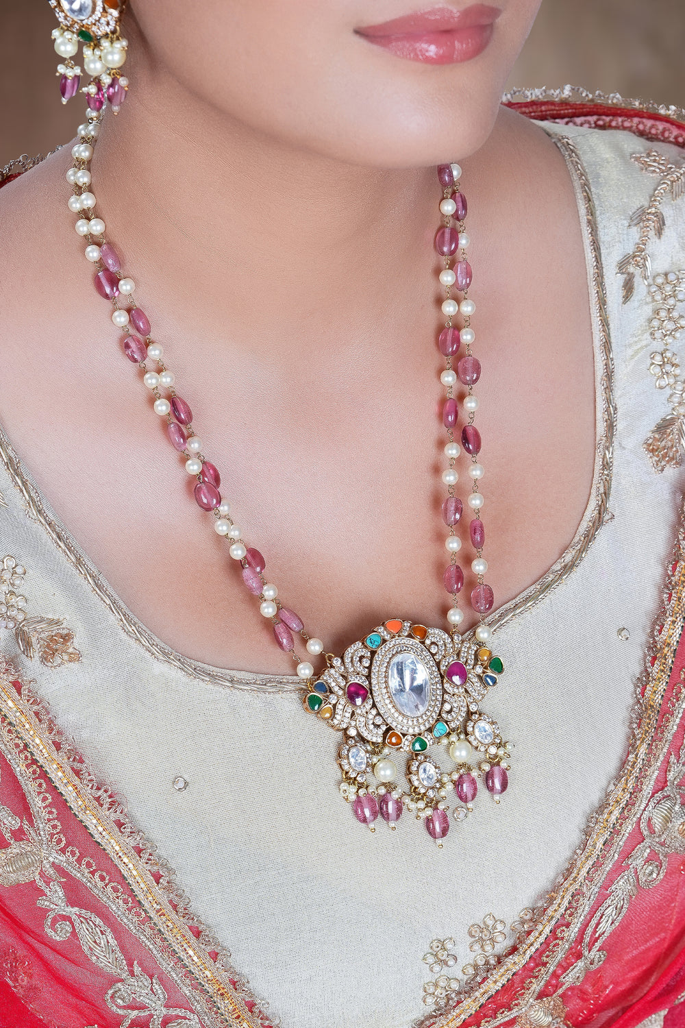 The Navya Pendant Set is a vibrant symphony of colors and royal charm. The pendant is designed with an oval shaped White Polki stone at its center, surrounded by a halo of Cubic Zerconias and Navratna inspired Hand-Designed Takkar stones. The intricate gold-tone frame is further enhanced by delicate pearl and red bead tassels, adding depth and festive flair. The chain is crafted with alternating ivory pearls and translucent wine-red beads, which beautifully complement the pendant’s colorful brilliance. Matching earrings mirror the pendant’s design, creating a cohesive and luxurious set perfect for festive occasions.