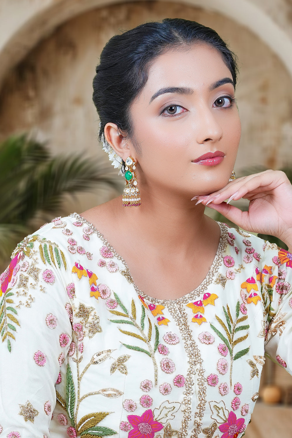 The Neelambari Jhumkas are a majestic blend of Mughal Heritage and timeless Temple Artistry. This three-tiered earring showcases opulence in every element — from the pear-shaped White Polki stud on top to the radiant Emerald-hued round Cabochon centerpiece, and culminating in a bell-shaped jhumka dome encrusted with radiating White Polkis.The jhumka sways with pearls and red like temple bells softly widespread.Each curve, each cut — a tale retold,
