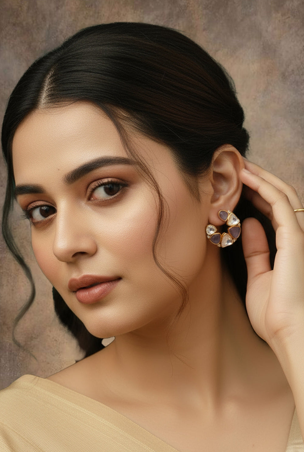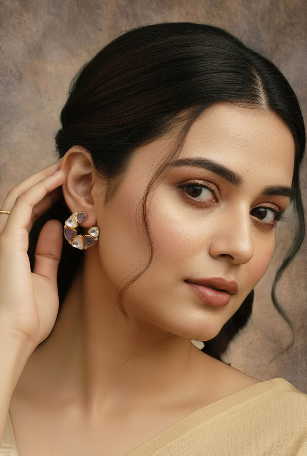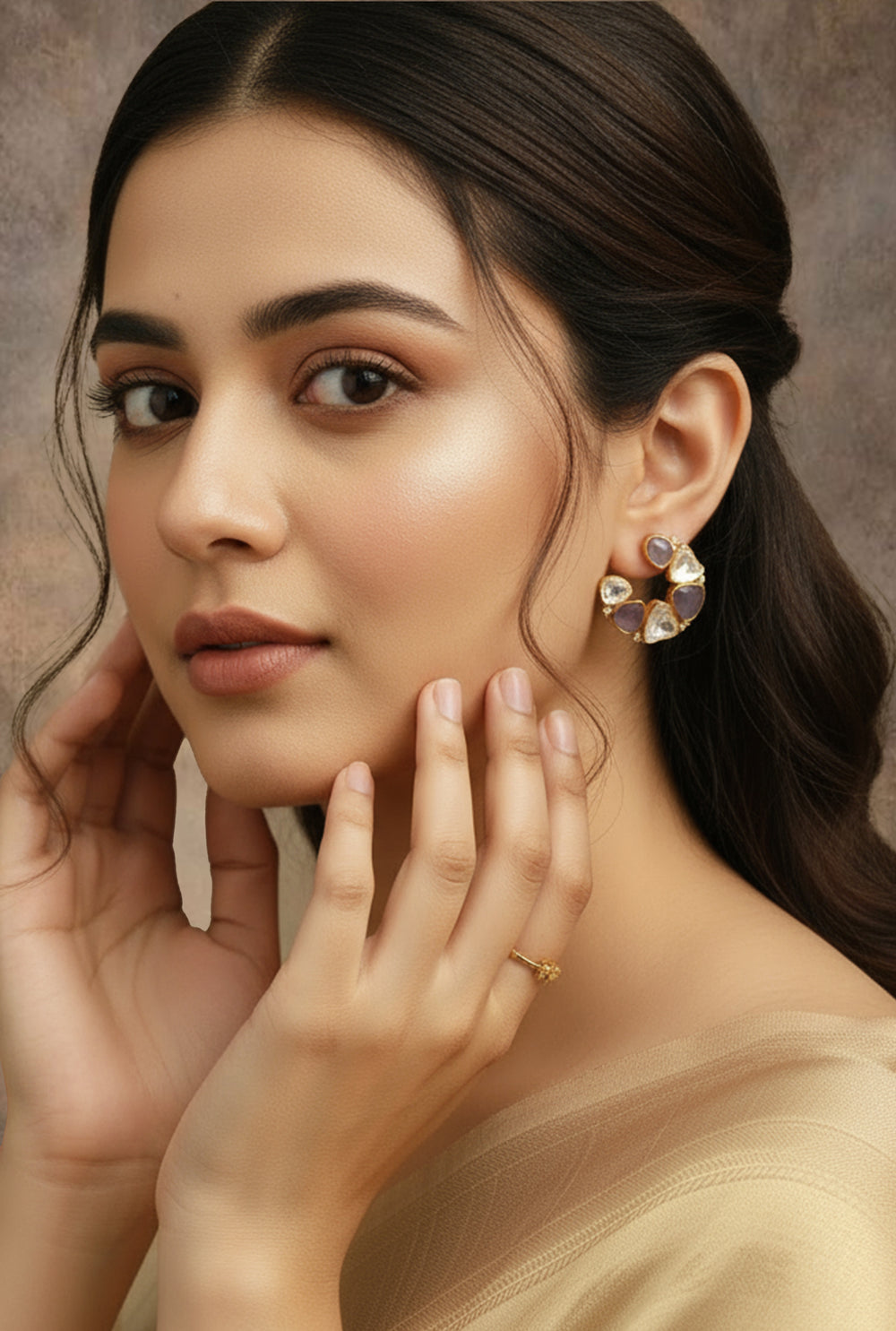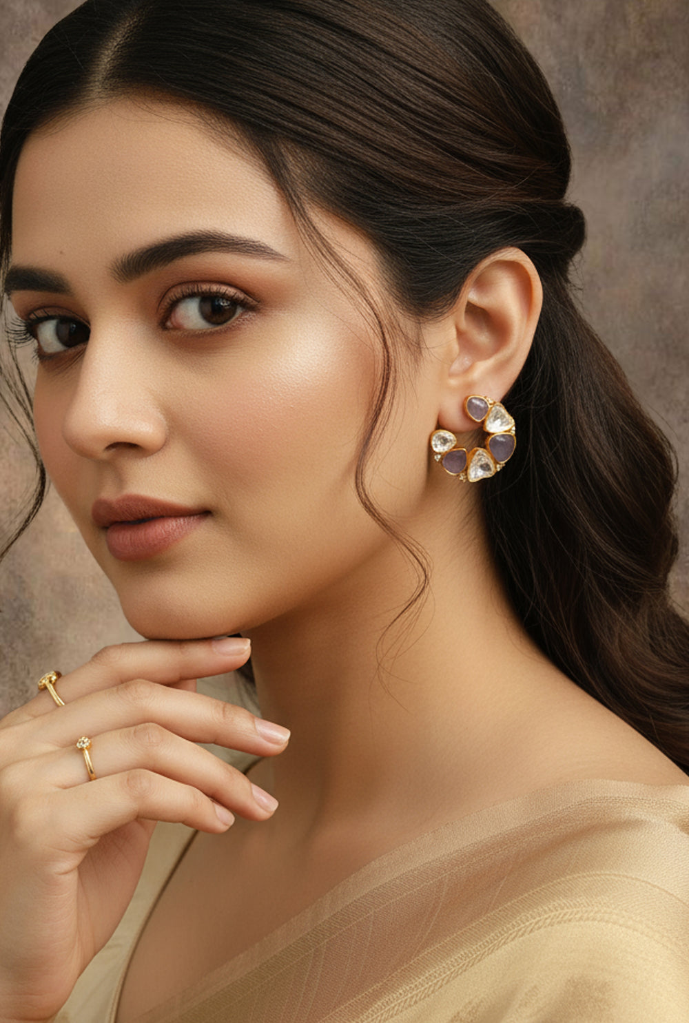 Inspired by the serene elegance of lotus petals and deep sapphire tones, the Neelkamal Hoops are a refreshing take on Heritage hoops. Designed with alternating Hand-Designed Takkar work and White Polki stones in tear-drop shape, these earrings form a graceful half-moon shape. Accentuated with ornate golden filigree backs, this piece exudes Artisanal Finesse and Festive Charm.
