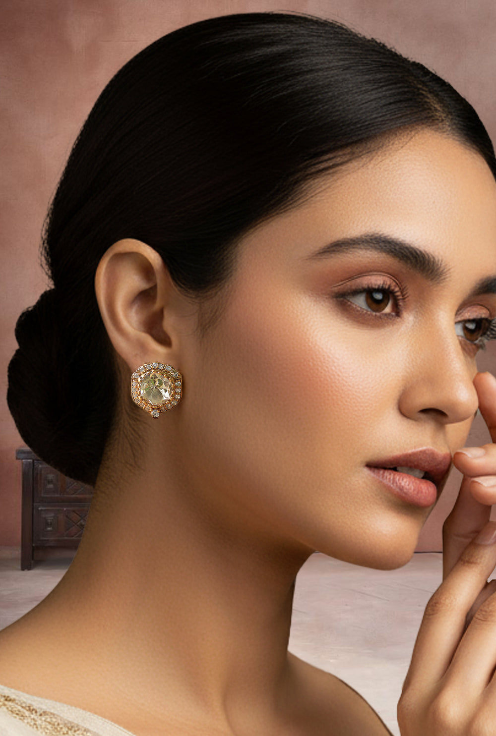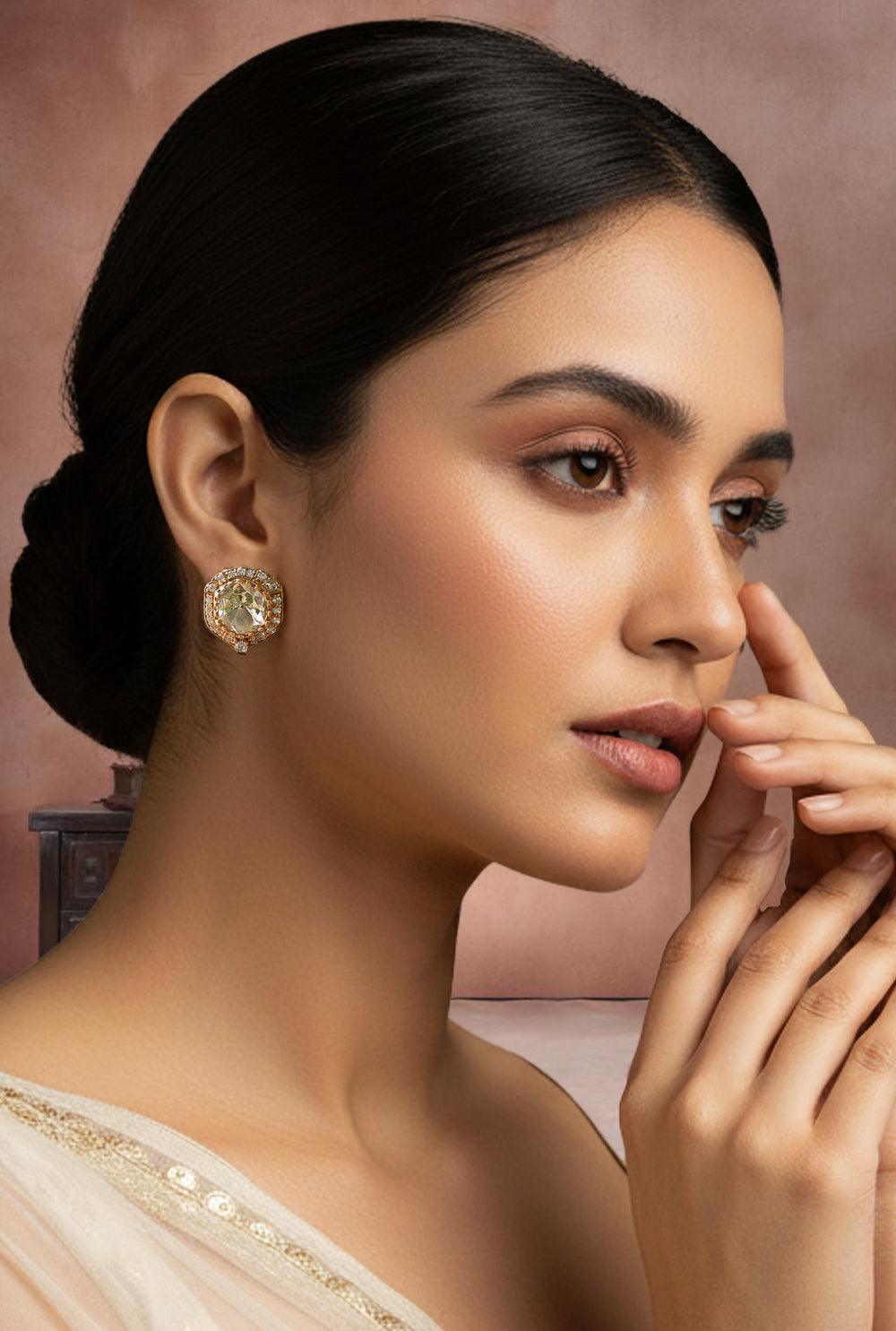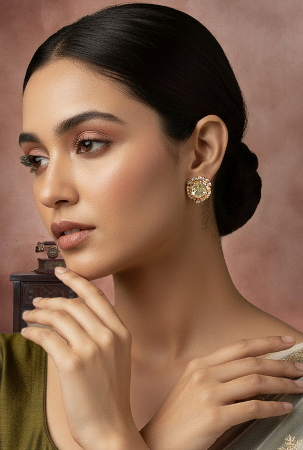 Introducing “Noorika Tops” — an elegant blend of boldness and brilliance. Inspired by the everlasting beauty of solitaires, these tops feature a large Moissanite Polki stone at the centre, surrounded by a delicate line of sparkling Cubic Zirconia that create a glowing halo effect.