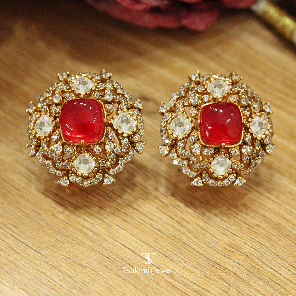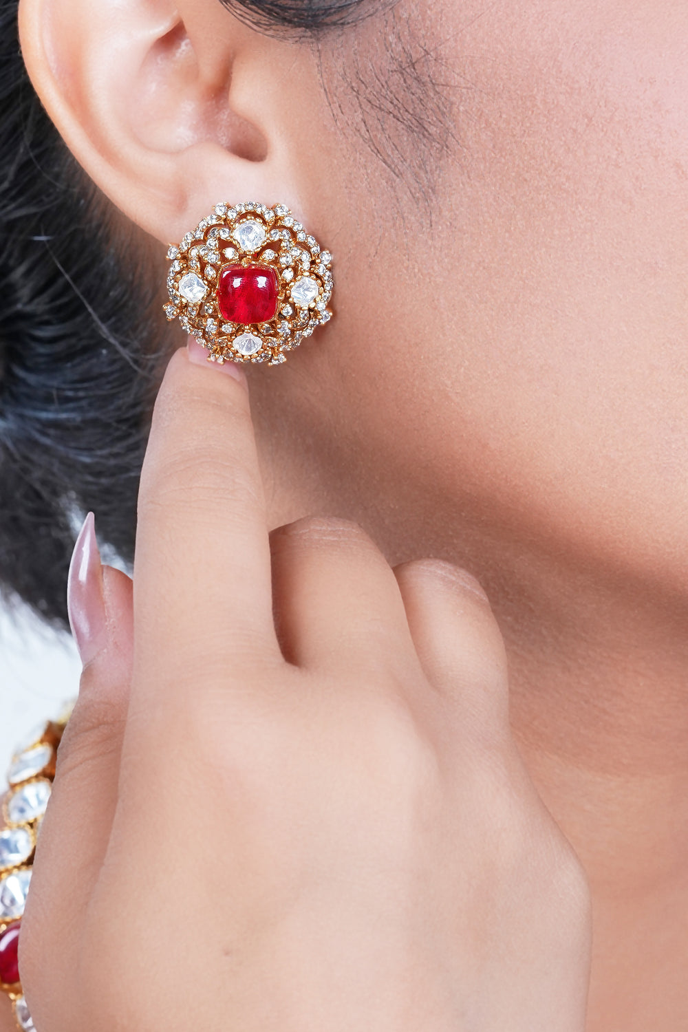 Raktima double-layered haar set is a stunning blend of Royalty and Tradition, crafted to create a bold and majestic statement. Alternating cushion-shaped Polki stones and deep ruby-hued Cabochon stones form a rhythmic pattern, radiating Regal Allure. The rich contrast of the white Polki’s luminous shine with the fiery red stones captures a perfect harmony of elegance and power. Paired with intricately designed floral stud earrings adorned with a ruby center, this set is ideal for weddings, festive celebrations, and grand occasions.
