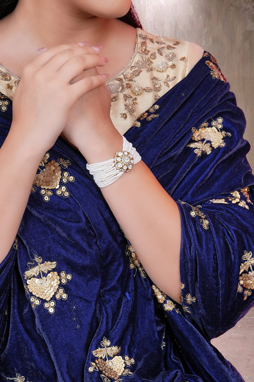 The Rasika Bracelet is an opulent blend of tradition and elegance, crafted to adorn your wrist like a jewel from royal courts. Featuring multiple strands of creamy ivory pearls, this bracelet exudes timeless sophistication. At its heart lies a grand circular motif, studded with White Polki stones arranged in a floral cluster, framed by delicate Cubic Zirconia detailing. The golden accents further enhance its regal aura, making it the perfect statement piece for festive occasions, weddings, and grand celebrations.
