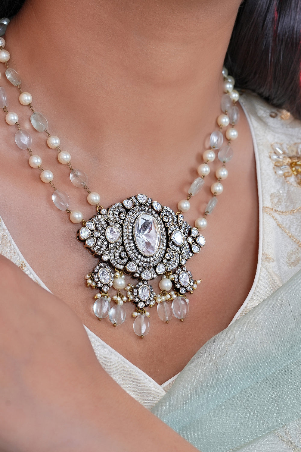 The Shubhra Pendant Set exudes timeless sophistication with its soft ivory tones and antique-inspired design. The statement pendant features a large Oval shaped White Polki stone at its center, framed by smaller Polki stones and delicate Cubic Zirconia in an intricate vintage floral pattern. Dangling pearl and translucent beads add a touch of graceful movement, enhancing its regal appeal. The beaded chain, made with alternating pearls and translucent beads, complements the pendant beautifully. The matching earrings mirror the pendant’s elegance, completing this luxurious set—perfect for weddings, grand festivities, and traditional occasions.