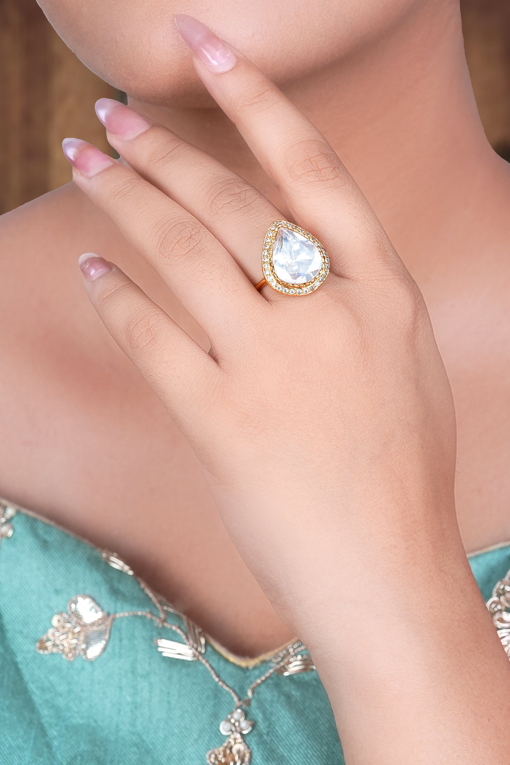 This Moissanite Polki ring embodies pure sophistication with its elegant teardrop design. The large Polki stone, resembling a drop of glistening dew, is framed by a halo of fine Zirconia, enhancing its glow and giving it a Royal yet Contemporary Charm. Set on a smooth gold-toned base, this ring captures the essence of luxury with a minimalistic approach. Perfect for women who love a bold, statement piece that speaks of heritage and grace.