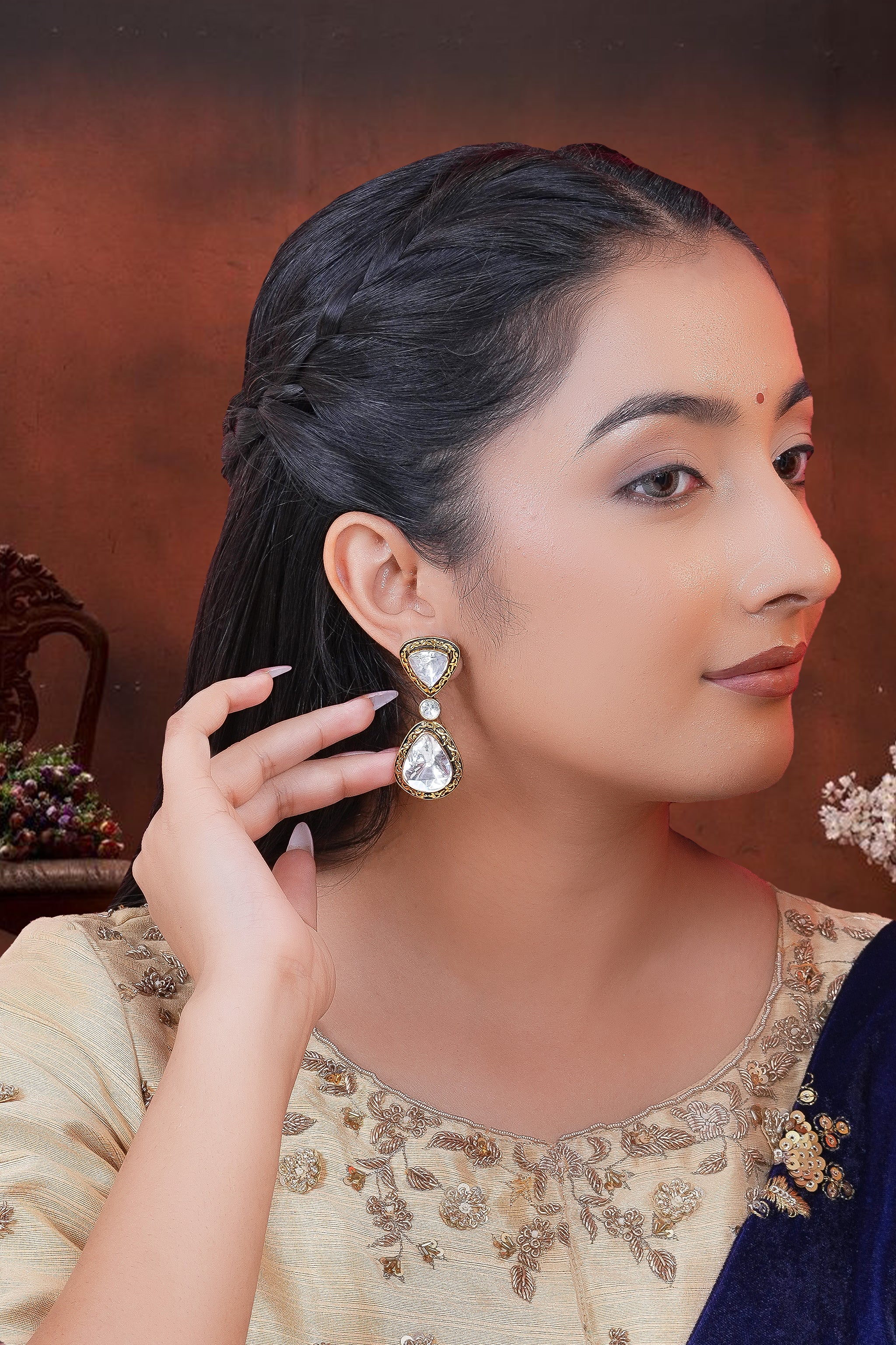 Radiating a timeless charm, the Zarina Dangler bring together Mughal-inspired grandeur and contemporary finesse. Each earring features a striking combination of a triangle-cut and pear-cut clear Mossanite Polki, set in a frame which is adorned with intricate engraved floral motifs, adding an old-world regal texture that enhances the brilliance of the stones.Suspended delicately by a circular shaped connector, this tiered composition creates movement and catches light with every turn, making it a showstopper piece for festive occasions, evening soirées, or elegant traditional wear.